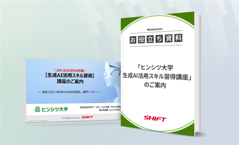 SHIFTが培ったナレッジを言語化・体系化した教育専門機関「ヒンシツ大学」の生成AI講座に関する資料です。生成AIの活用スキルを身につけ、業界のリーダーへと成長するための特別な講座をご紹介します。