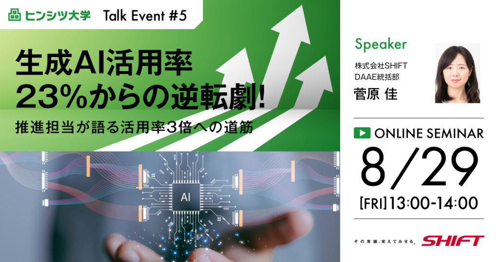 本セミナーでは、生成AIを社内で普及させるためにSHIFTが行った具体的な施策と、失敗談も踏まえた社内普及に向けた生の声をお届けします。